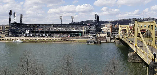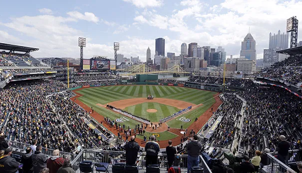 PNC公园的满座观众,左侧,观看匹兹堡海盗队在2013年4月1日星期一与芝加哥小熊队的开幕日棒球比赛。小熊队以3-1获胜。公园位于阿勒格尼河北岸,靠近罗伯托·克莱门特桥,右侧。美联社照片/基思·斯拉科西克