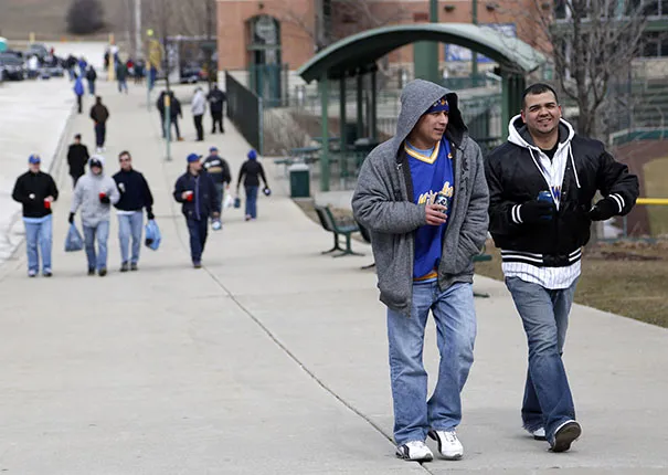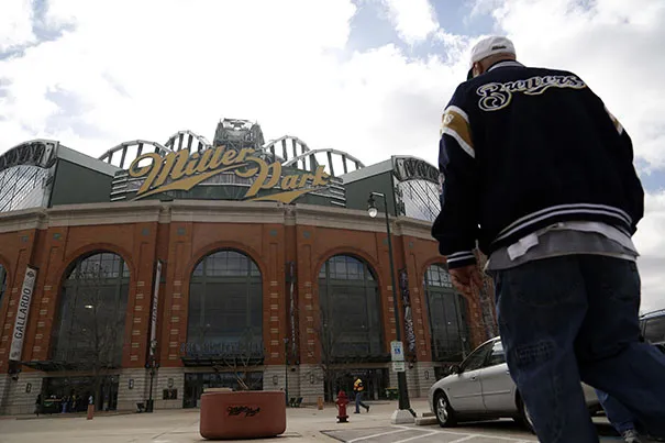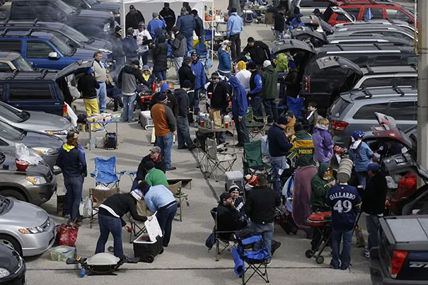 球迷在米勒公园外进行尾随聚会,准备参加2013年4月1日星期一在密尔沃基举行的密尔沃基酿酒人队与科罗拉多洛基队的开幕日棒球比赛。美联社照片/杰弗里·菲尔普斯