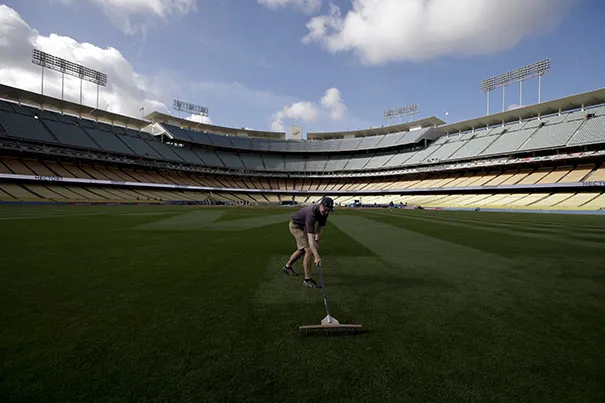 一名工作人员在2013年4月1日星期一洛杉矶道奇队与旧金山巨人队的赛季开幕棒球比赛前清扫草坪。美联社照片/洪在熙