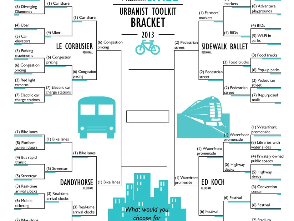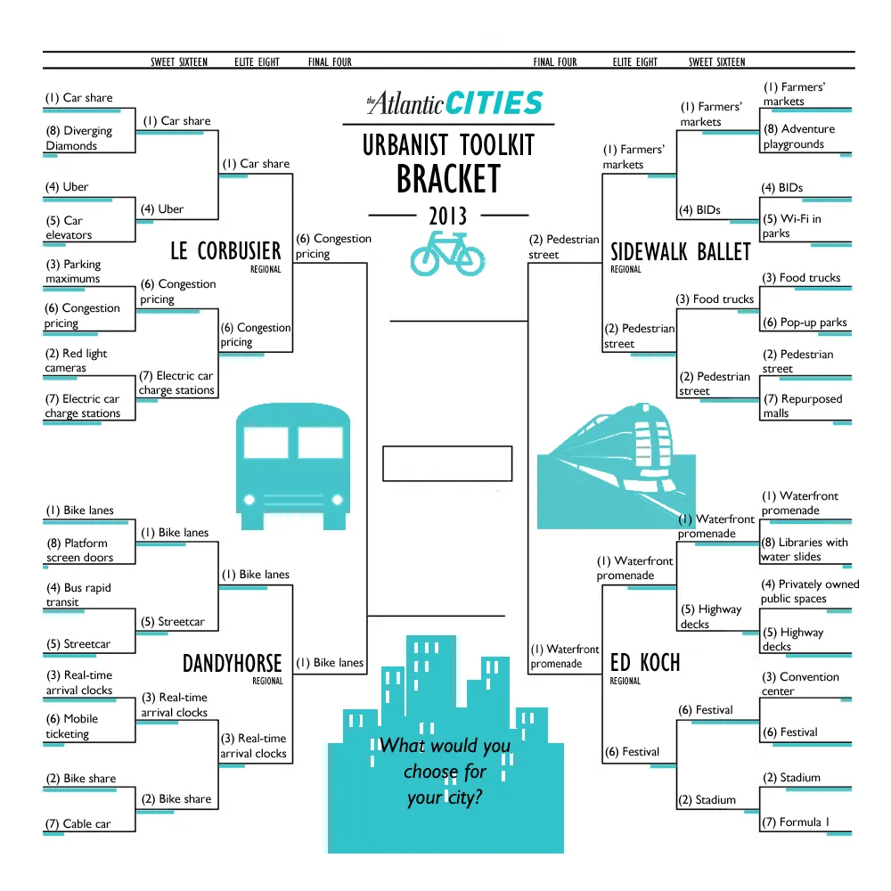 正如我在第一篇帖子中提到的,我们试图根据这些概念的受欢迎程度和普遍性进行种子分配。拥堵定价在这个国家几乎不存在,因此种子排名较低:它仍然是一项难以实现的改革。自行车道相对常见,尽管没有美国城市的网络像哥本哈根或阿姆斯特丹那样全面。