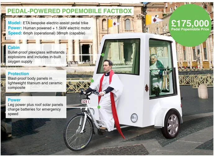 毕竟,这是一位 乘坐 公共汽车系统长达15年的人。你不觉得他会喜欢通过骑着无排放的三轮车在世界上展示他对可持续发展的承诺吗?这与梵蒂冈最近的 绿色举措 完全一致,毕竟教皇本笃的电动车、太阳能电池板和碳抵消林业计划。