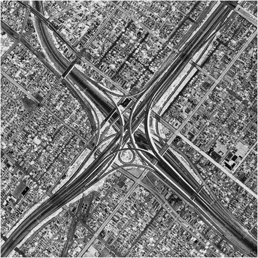 这些洛杉矶的诡异照片标志着摄影师在几个方面的转变:显然它们是黑白的,他是从直升机而不是飞机上拍摄的。“那是因为城市环境上空有很多空中交通,”他说,回忆起直升机的无线电声,“有一架747正在降落,你需要降到9000英尺并在那里停留一段时间。”