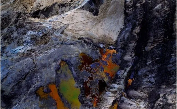 自从这位摄影师在1980年代开始记录受损的矿区以来,环境破坏的史诗规模就成为了梅塞尔的生计。通常他在一架塞斯纳飞机内工作,他拍摄了西南矿区色彩鲜艳但被氰化物侵袭的“浸出场”,以及一个因EPA起诉其危险废物而被污染的犹他州镁公司周围的土地,还有一个被洛杉矶人吸干、变成干燥、有毒尘土喷发沙漠的巨大湖泊。