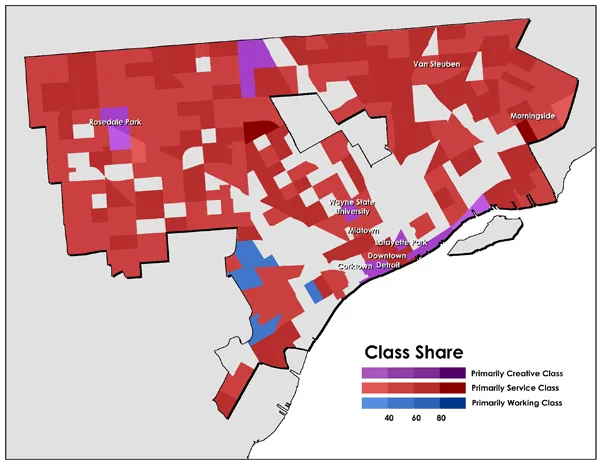 城市 贡献者 米歇琳·梅纳德 通过电子邮件描述了这些地区:“伯明翰和布loomfield Hills 是底特律汽车公司和主要汽车供应商高管的传统郊区。格罗斯波因特是老钱;伯明翰和布loomfield Hills 是新钱。”伯明翰是一个经典的世纪之交的混合用途步行郊区,拥有两家电影院、商店、餐馆、咖啡馆、夜生活场所和街头咖啡馆,以及都市中最豪华的精品酒店——汤森德酒店。梅纳德补充道:“皇家橡树和费恩代尔在过去 20 年中发展成为伯明翰和布loomfield Hills 的更时尚替代品;费恩代尔也是同性恋和女同性恋社区的中心。”在圣克莱尔县的乡村社区中也有显著的创意阶层存在,这些社区环绕着圣克莱尔湖,靠近流经美国和加拿大之间的圣玛丽河。在郊区,服务阶层位于这些创意阶层节点的边缘,正如我们在本系列中覆盖的大多数其他地区的情况一样。(请参见本文末尾的完整列表。)