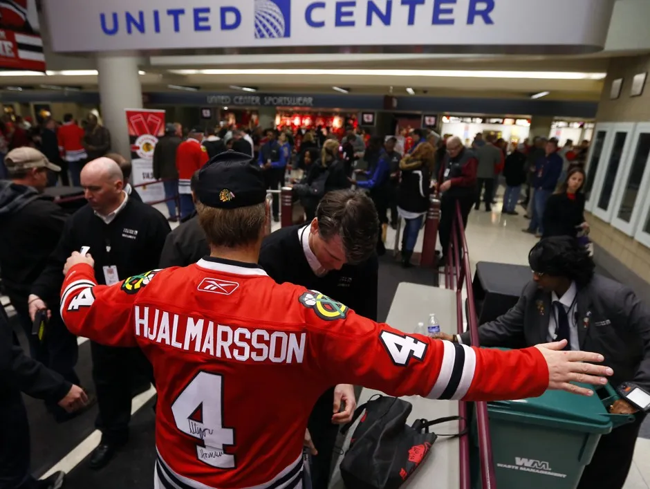 顶部图片:由于波士顿的爆炸事件,顾客在芝加哥达拉斯星队与芝加哥黑鹰队的NHL冰球比赛开始前接受了严格的安全检查。(杰夫·海恩斯/路透社)
