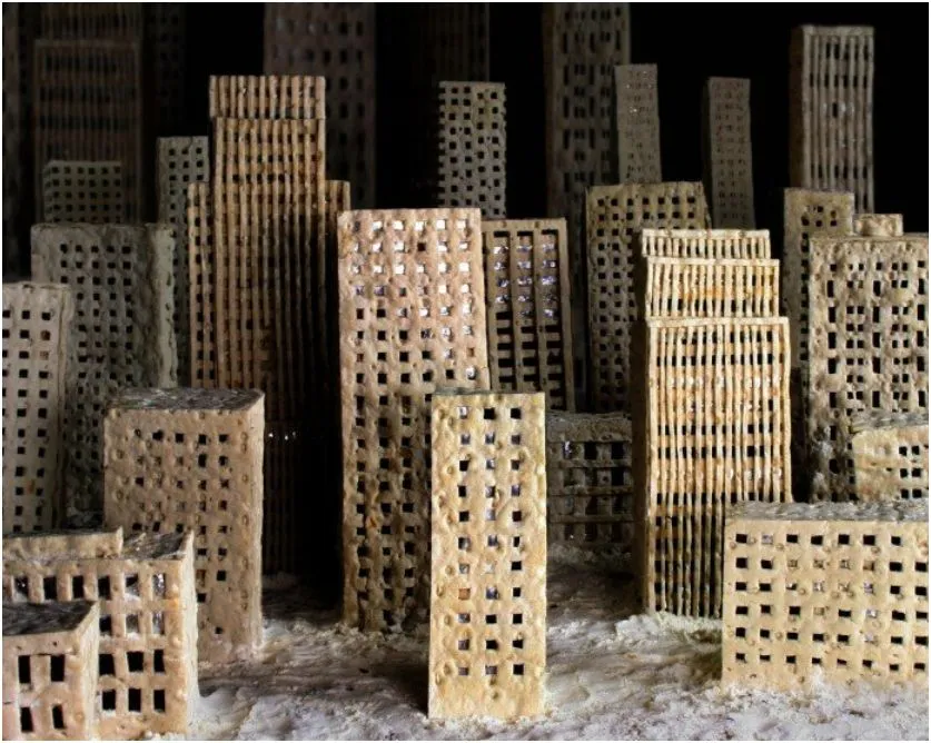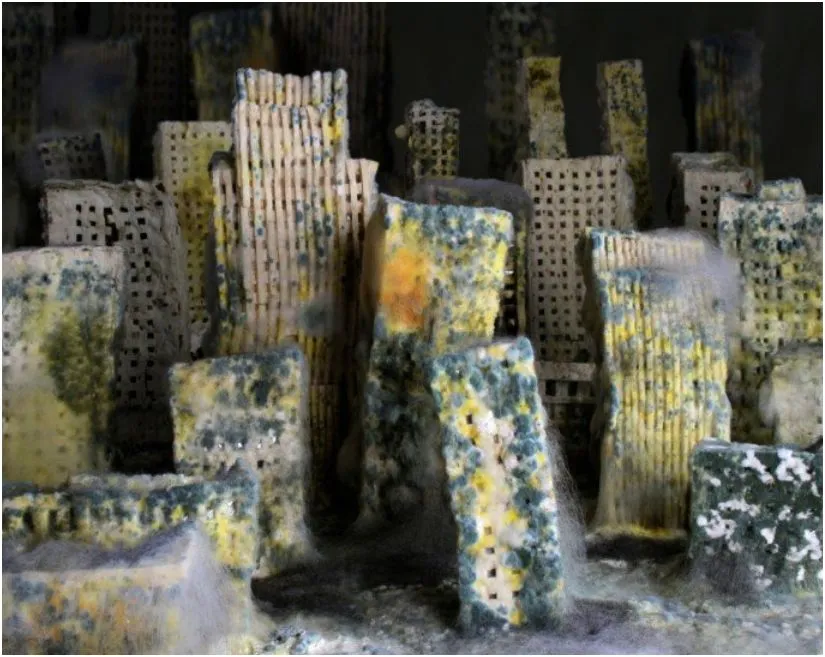 作为一名有未来愿望制作自己科幻电影的舞台设计师,马滕松想要看到这一衰退过程的实际情况。因此,这位位于斯德哥尔摩的艺术家收集了一些易腐烂的材料——在这种情况下,是面包片——并开始在她的工作室里建立一个可食用的城市。然后,她每天拍摄一次,持续六个月,捕捉生命之源的腐烂,变成一个弯曲、奇异色彩的腐烂团块。