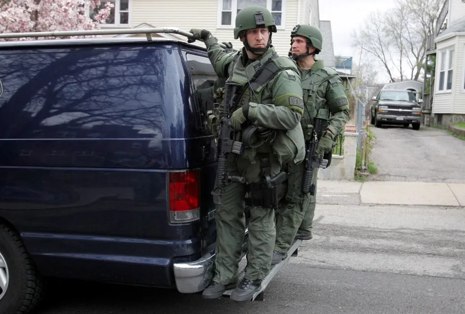 顶部图片:特警队在马萨诸塞州沃特镇进行逐户搜索,寻找波士顿马拉松爆炸案中唯一剩下的嫌疑人德佐卡尔·察尔纳耶夫,时间为2013年4月19日。(杰西卡·里纳尔迪/路透社)