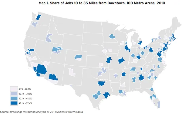 在同一时期,美国100个最大都市区内距离市中心三英里范围内的就业份额保持稳定。然而,2010年的这一份额仍然明显低于2000年。报告中的这张地图显示,包括芝加哥、达拉斯和西雅图在内的许多都市区中,超过45%的工作仍然位于距离市中心超过10英里的地方: