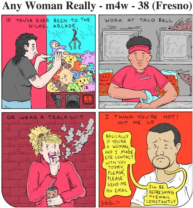 在什么构成好的漫画方面,斯坦顿寻找有趣、简洁的帖子,他可以逐字引用。他不会插图较长的帖子,这些帖子通常是“感伤的、让我感到可怜的帖子”。每当他感到完全缺乏灵感时,他知道有一个地方能激发他的创造力: 波特兰的错过的连接。“那里有太多细节适合漫画的格式,”他说,比如一个女人“牵着你的鸡和我心中的金色牵引绳在霍桑街上漫步”,还有一个面部毛发爱好者在酒吧里看着,想要“把你们都当作性感的胡须动物园来对待。”