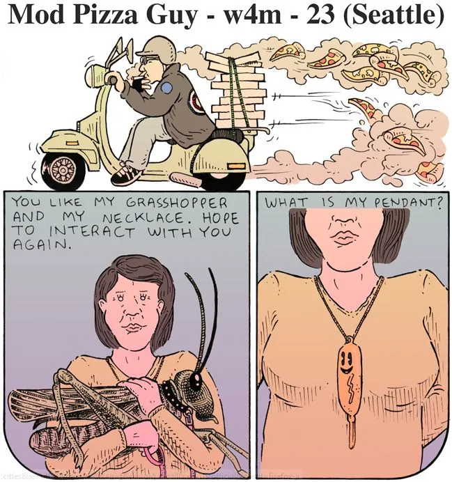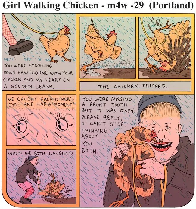 抱歉,艺术家们为了笔而拼搏:这已经有人做过了,这本选集,现在是詹姆斯·斯坦顿令人沮丧但又以某种方式搞笑的项目,"错过的连接漫画。“斯坦顿是一位28岁的西雅图漫画家,他在多个大都市地区的Craigslist个人广告中寻找引人注目的帖子标题。“很多广告看起来并不那么有趣,”他说,“然后我会看到一个,感觉像是,哦,是的,这肯定会很奇怪。没有办法避免。”在错过的连接的奇异宇宙中,“奇怪”是相对的:斯坦顿描绘了从一个渴望她臭脚伴侣的朋克女孩,到一个绝望的灵魂拼命点击收件箱寻找回复,再到一个寻找他曾在蜜蜂袭击时庇护的美丽女性的男人。