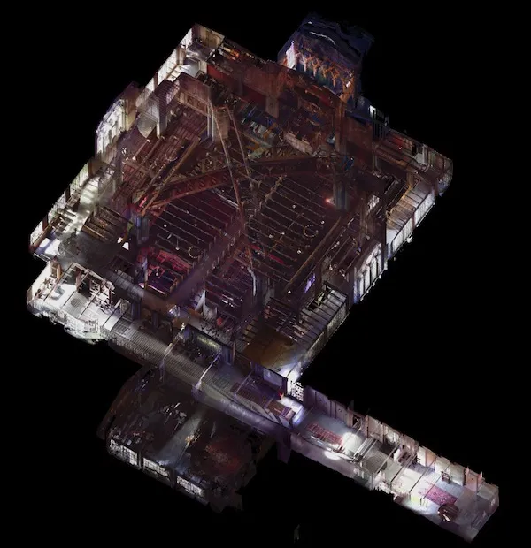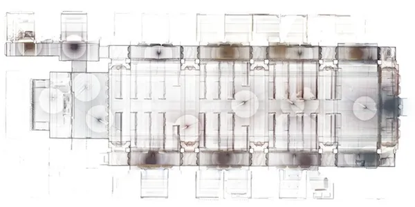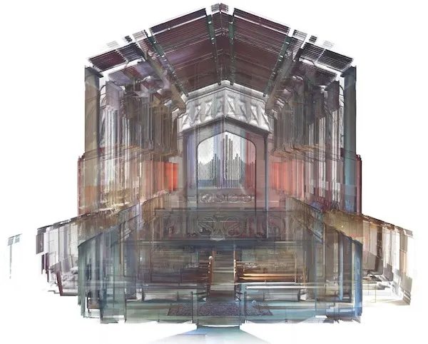 佩奇将他11磅重的激光扫描仪带入旧金山的老教堂,在那里经过几个小时的仔细定位(每次扫描旋转在三脚架上大约需要五分钟)可以产生这样的图像: