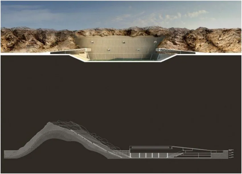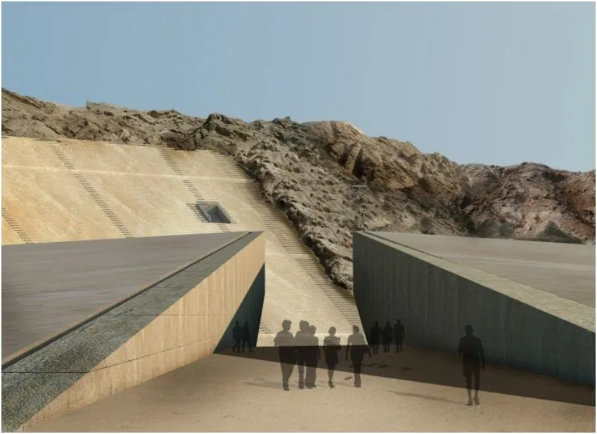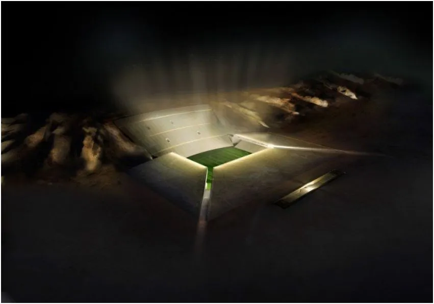 人们可能会质疑在该地区最具标志性的地标之一上雕刻以腾出空间给一个巨大的 商业场所。至少建筑师们已经规划出步骤,使这个项目看起来更自然。他们计划保存挖掘出的岩石,并将其研磨与粘合剂混合,形成一种新型建筑材料。这种再利用的材料将构成体育场的主要层次。他们还希望用从沙漠中取来的沙子覆盖屋顶,帮助这个雄伟的建筑融入周围的景色。