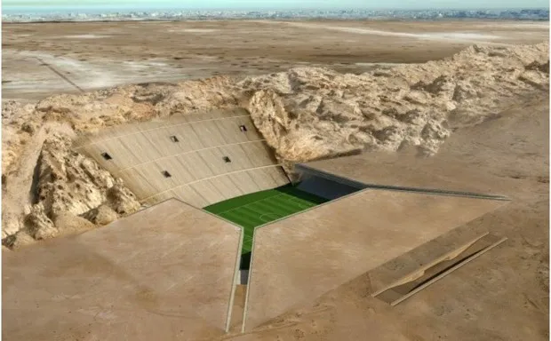 人们可能会质疑在该地区最具标志性的地标之一上雕刻以腾出空间给一个巨大的 商业场所。至少建筑师们已经规划出步骤,使这个项目看起来更自然。他们计划保存挖掘出的岩石,并将其研磨与粘合剂混合,形成一种新型建筑材料。这种再利用的材料将构成体育场的主要层次。他们还希望用从沙漠中取来的沙子覆盖屋顶,帮助这个雄伟的建筑融入周围的景色。