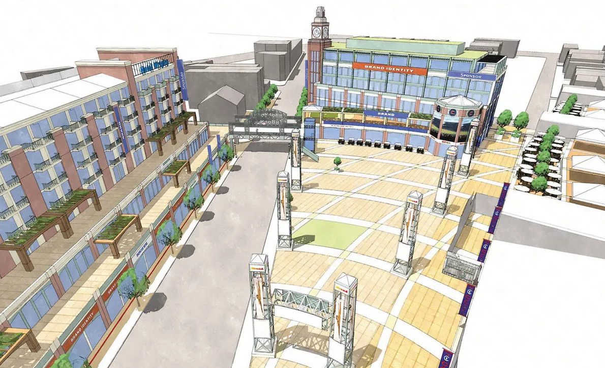 新的渲染图不仅限于体育场本身,还提议在街对面建设两座新建筑(通过人行道连接)。新增的设施将包括一座175间客房的酒店、一家运动俱乐部、零售空间,以及增加的广告面积。体育场前的公共广场也将成为一个全年开放的空间,提议举办社区活动,如电影放映、农贸市场、滑冰,当然还有更多的广告空间。