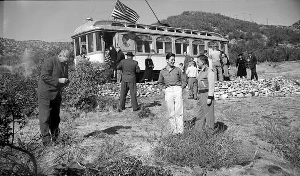 但Descanso有一个有趣的第二幕,作为一种不同的休息场所。在1940年,它被安装在凯洪山口的萨米特,位于圣贝纳迪诺山和圣加布里埃尔山之间,为铁路迷提供了一个聚集的地方,等待火车沿山轨道经过。该车配备了床铺和烹饪设施。