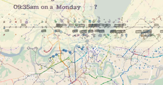 他们的项目,赢得了一个 城市数据挑战赛,我们之前 提到过 的,是基于每个城市的公交路线数据构建的,记录了公交车到达每个站点的时间、停留的时长,以及估计的上车乘客数量(最后一个数据点是通过激光在所有门口上下车的乘客触发计算的)。