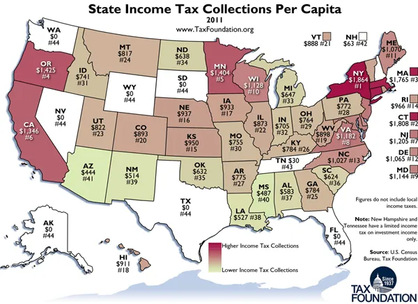 第二张地图绘制了2011年每人收取的州所得税金额。收取最多的州以红色阴影表示(阴影越深,收取越多),而税收较低的州则为白色。每人收取高额税款的州主要集中在东北部(纽约、马萨诸塞州、康涅狄格州、新泽西州)、西海岸(俄勒冈州和加利福尼亚州)以及上中西部(威斯康星州和明尼苏达州)。每人收取较少税款的州主要位于阳光地带——佛罗里达州、德克萨斯州和内华达州都是零税州——以及大平原(怀俄明州和南达科他州),还有令人惊讶的华盛顿州。