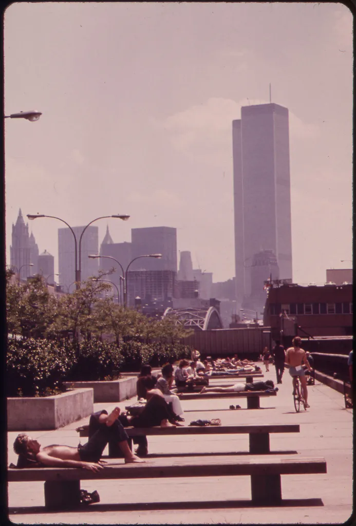 "在俯瞰哈德逊河的码头上暂停放松,距离曼哈顿下城新建的世贸中心几个街区 05/1973