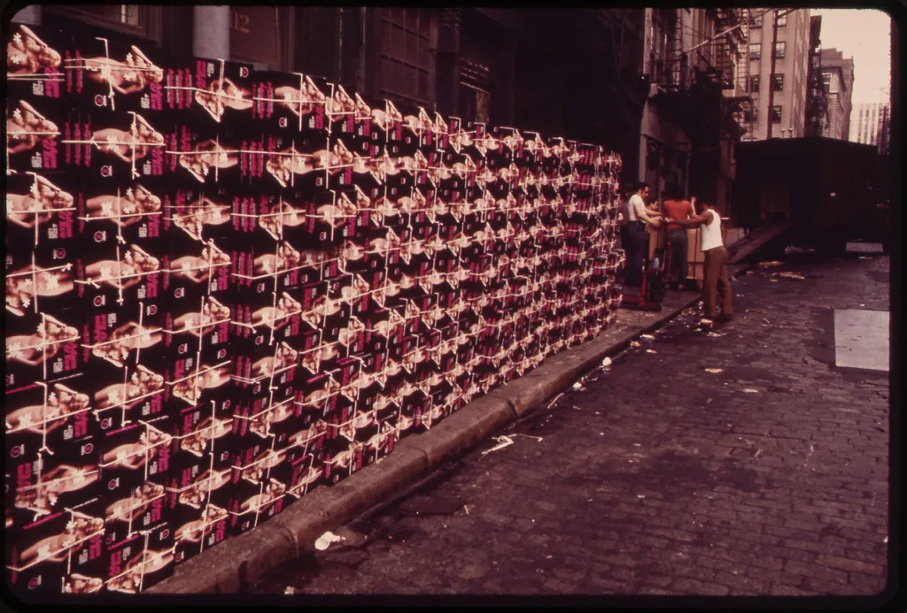 “货运搬运工在下曼哈顿里德街的仓库外堆放女装箱子--从西百老汇向东看 05/1973”