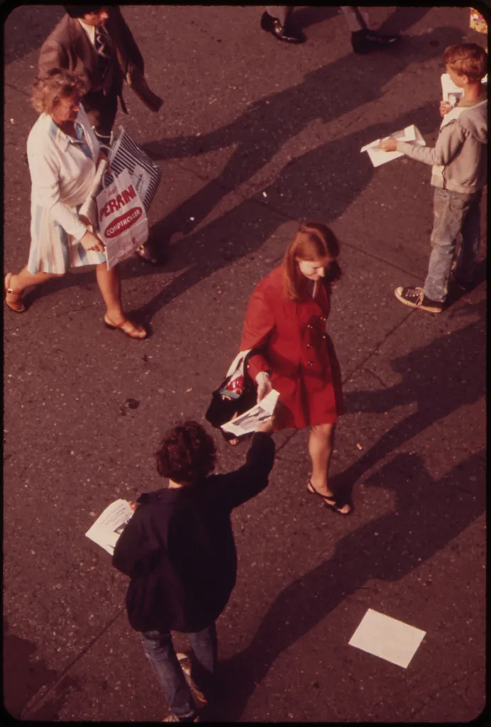 "不减步伐,回家的通勤者在斯塔滕岛渡轮码头伸手索取街头分发的传单 05/1973