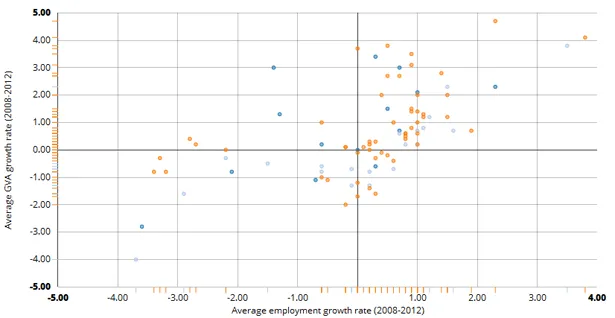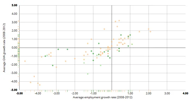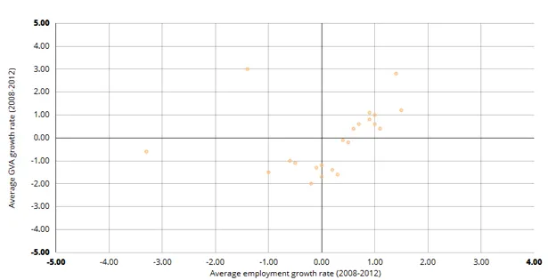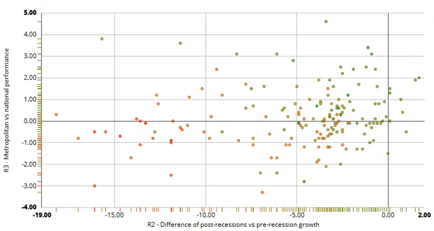 这并不令人惊讶:城市的多样性远大于国家,显然一个大都市区域可以在国家经济放缓时取得成功,或者在繁荣时期被抛在一边。看看阿伯丁(上方左上象限中独自悬浮的粉色点),其石油产业使其成为英国少数几个成功的大都市之一。