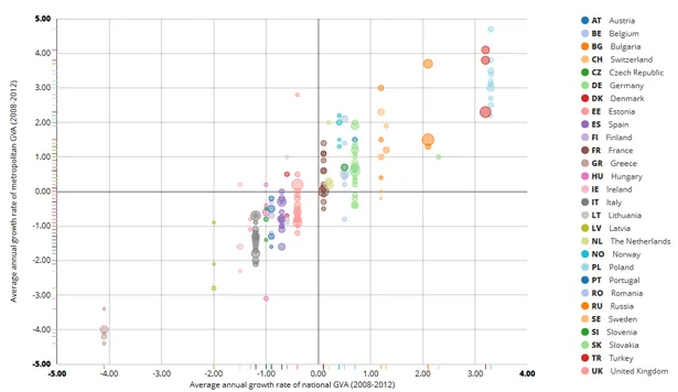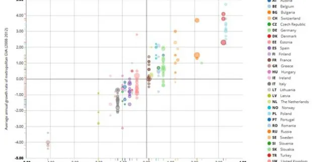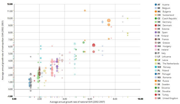正如预期的那样,大都市的命运随着国家增长率的变化而起伏,推动或跟随一个国家更大的经济轨迹。在下面的图表中,大都市用点表示,y轴按2002年至2007年间的年均增长率排序,x轴按同一时期的国家GVA排序。左下角的垂直线代表葡萄牙和意大利,而图表右侧则显示了俄罗斯和波罗的海国家。