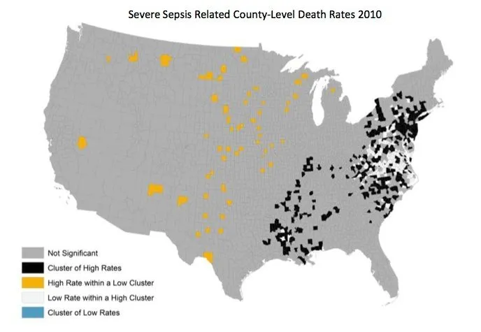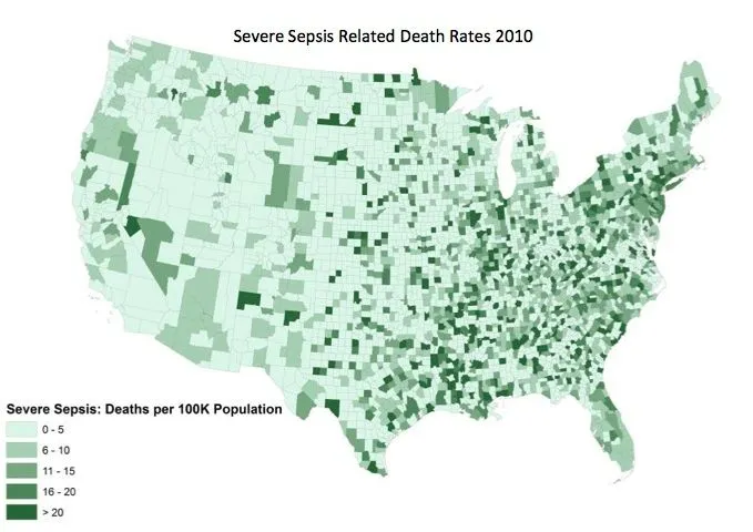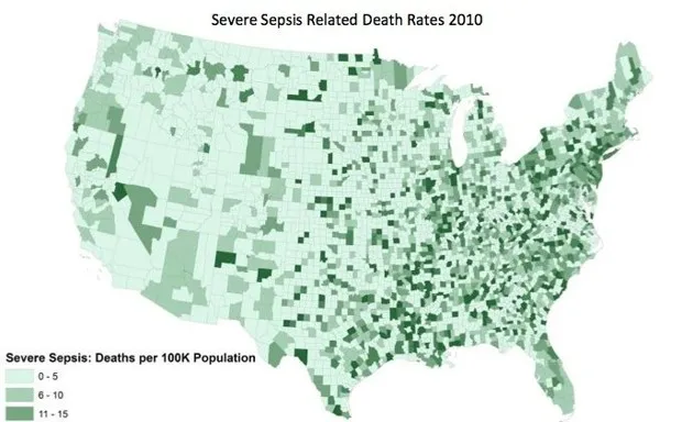 看来美国东半部正遭受不成比例的痛苦。在这张第二张地图中,这种不平等看起来更加明显,显示了2010年严重脓毒症死亡率高的县: