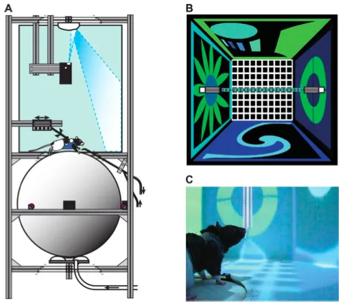 梅塔和他的同事们证明了这一研究——当然——是针对老鼠的。即使对于老鼠来说,在现实世界中真正消除所有感官线索(食物碎屑、气味标记、洒落的液体)也是不可能的。因此,他们创建了一个虚拟现实环境。老鼠被放置在一个追踪球上,固定在一个小背心的装置上(科学插曲:“一两天之内,”梅塔说,“它们喜欢身上有个背心的想法。它们真的会穿着背心四处走,这非常有趣。”)。然后,老鼠沉浸在一个虚拟现实屏幕中,屏幕上显示着一间墙壁装饰着不同蓝色和绿色形状的房间。它们随后在这个虚拟房间的跑步球上奔跑。