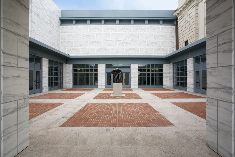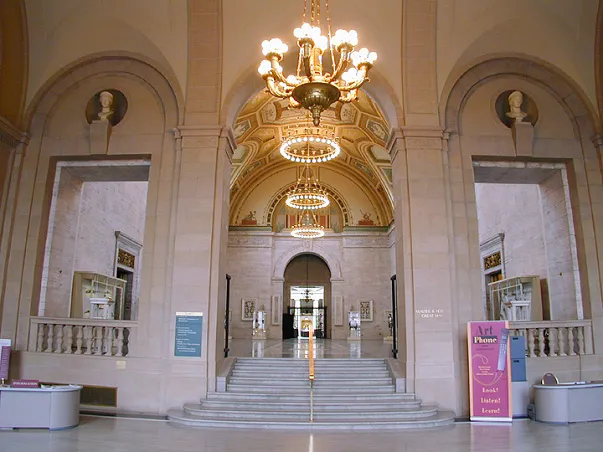 底特律艺术学院在伍德沃德大道入口的楼梯上走后,底特律艺术学院,经过罗丹的“思想者”雕像并进入主大厅,游客们很快被一个有四面墙壁的天窗庭院吸引,墙壁上绘有迭戈·里维拉的画作。这些壁画在许多方面象征着博物馆的身份:以令人敬畏的规模展现艺术,作为汽车城工业辉煌时代的见证。