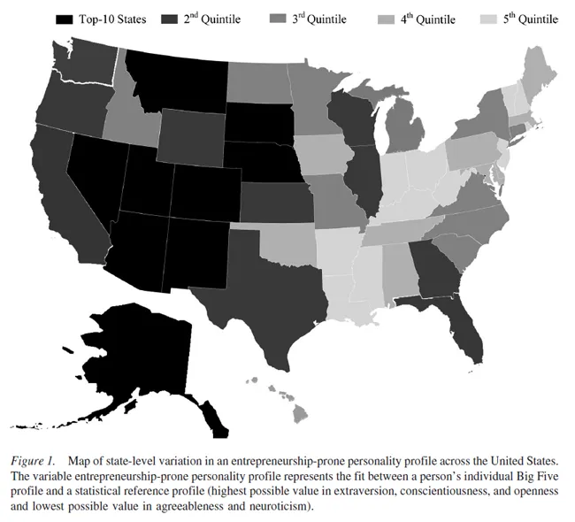 一项最近的研究考察了个性在推动各州和地区创业中的作用。该研究标题为“美国、德国和英国创业倾向个性特征的区域分布及其相关因素:一种社会生态视角”,由一组美国和德国心理学家进行,包括德克萨斯大学奥斯汀分校的萨姆·戈斯林,并于四月在*《人格与社会心理学杂志》*上发表。