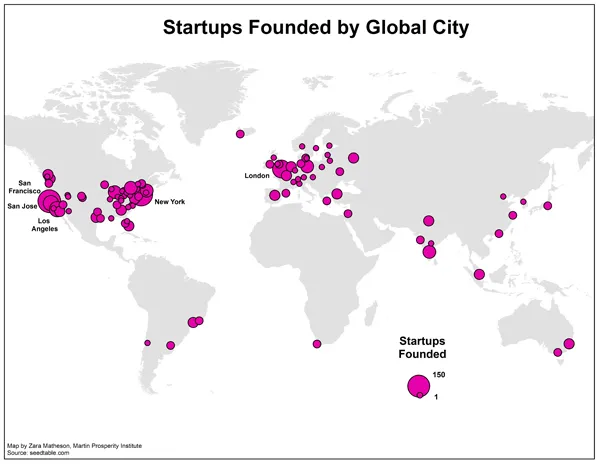 到目前为止,关于美国以外初创公司的地理数据一直很难获得,甚至几乎不可能。这就是为什么由 SeedTable 发布的全球初创城市相对较新的排名如此有趣。SeedTable是一个发现平台,建立在超过100,000家科技公司、投资者和企业家的开源数据库之上,数据可在 CrunchBase(TechCrunch出版物之一)上获取。SeedTable拥有自2002年以来成立的超过42,500家公司信息,包括这些公司是否获得天使投资或风险投资(天使投资者使用自己的资金;风险投资家从他人那里筹集资金),以及投资者是否已经退出,无论是通过首次公开募股还是收购。数据覆盖全球150个城市。数据按城市或市政区分报告,因此 马丁繁荣研究所的 扎拉·马西森 将数据按大都市区组织,然后按三个主要类别进行映射:全球初创公司、获得天使资金的公司和获得机构风险资本的公司。