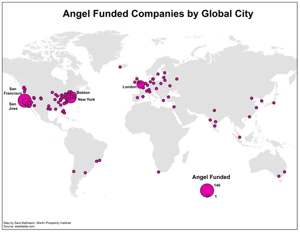 第二张地图绘制了获得天使投资的公司主要位置。天使投资通常来自富裕个人,往往是已建立的企业家,他们将自己的个人资金投资于初创公司。旧金山现在以138家公司获得天使投资位居榜首,纽约以117家紧随其后。伦敦再次排名第三,62家。圣荷西排名第四,60家,波士顿-剑桥第五,50家,洛杉矶第六,48家。芝加哥和费城并列第七,各19家,西雅图和波特兰并列第十,各18家。还有九个城市有10家或更多公司获得天使投资:多伦多(17家)、华盛顿特区(14家)、柏林和巴黎(各13家)、亚特兰大、巴塞罗那和博尔德(各12家)、都柏林(11家)和辛辛那提(10家)。
