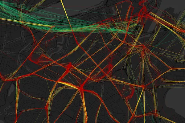 波士顿图谱随着实时信息的出现,交通数据可视化变得更加有趣。现在,我们不仅可以知道公交车站的位置,或者某条线路上火车的发车频率。在许多城市中,带有时间戳和地理参考的数据准确显示了某辆公交车在特定时间的位置……然后在几分钟后又在另一个时间的位置。这意味着我们可以计算出对许多通勤者来说最重要的指标:速度。