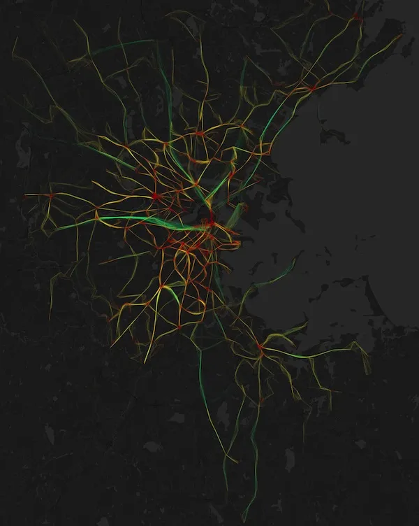 这个项目主要因其设计而令人印象深刻——“至少有一半是艺术,”伍德拉夫说——但这些每日地图也有潜力揭示系统如何在日常变化中、工作日与周末之间、正常运营与系统崩溃之间的模式。如果你住在波士顿,它们也可能简单地证实你对自己通勤的怀疑。