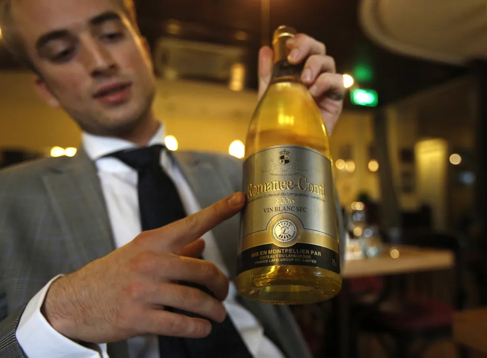 法国餐厅经理查尔斯·高德弗瓦(Charles Gaudfroy)在2013年6月6日于北京为路透社拍摄的照片中展示了一瓶在中国南部的一家酒商发现的假罗曼尼·康帝(Romanee-Conti)酒。高德弗瓦表示,他保留这瓶酒是为了好玩,“Vin Blanc”(白葡萄酒)和“Vin Rouge”(红葡萄酒)不应该印在同一个标签上。