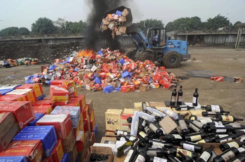 2011年11月6日,广西壮族自治区南宁,警察检查被查获的假酒瓶,然后销毁它们。