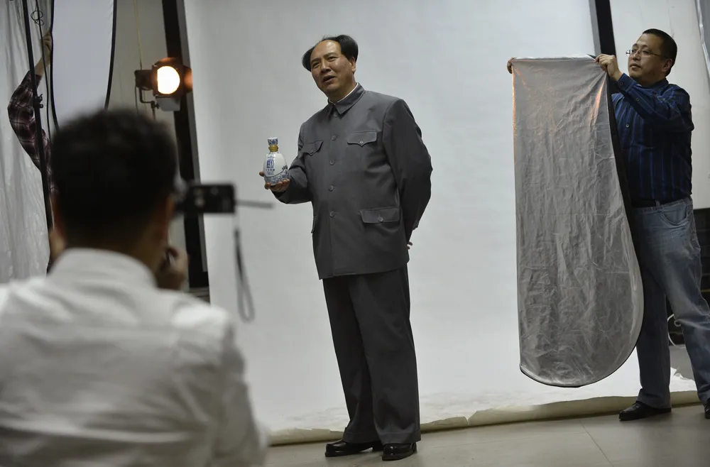 中国已故主席毛泽东的模仿者(C)在2013年4月16日于山西省太原的一家摄影工作室拍摄广告时,手持一瓶葡萄酒。