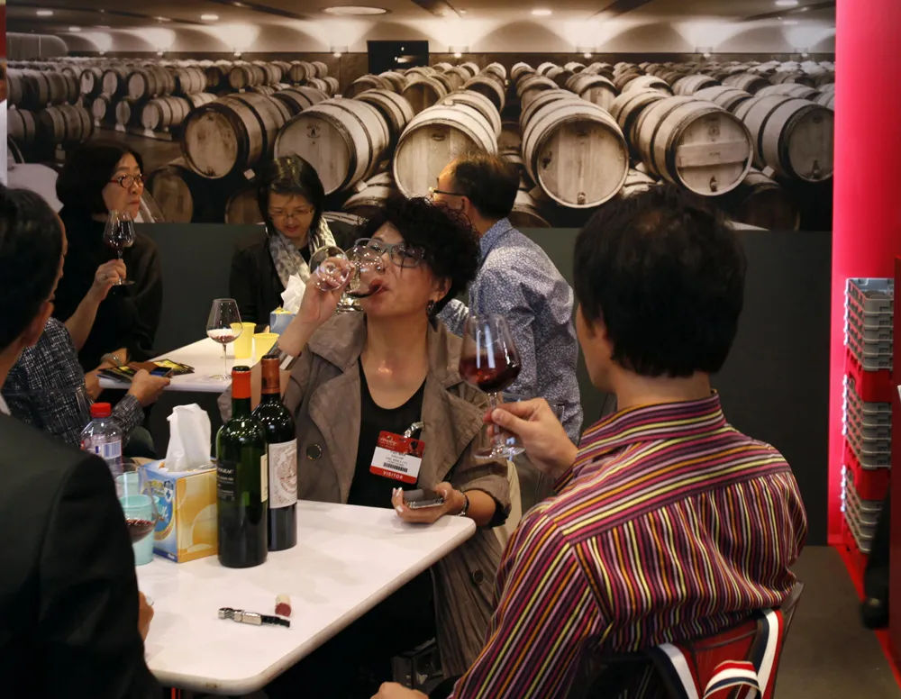 2012年5月29日,访客在香港的亚太葡萄酒博览会(Vinexpo Asia-Pacific)上品尝法国葡萄酒。根据主办方的说法,来自33个国家的超过14,000名访客参加了该博览会的第七届,这是该地区最大的国际葡萄酒和烈酒展览。(鲍比·叶