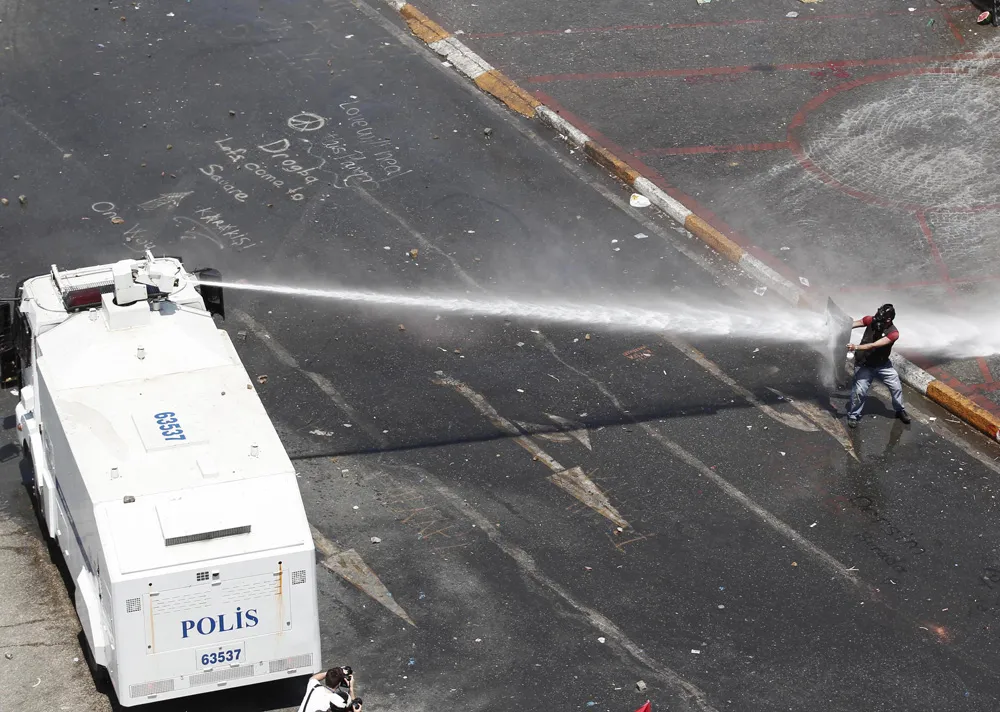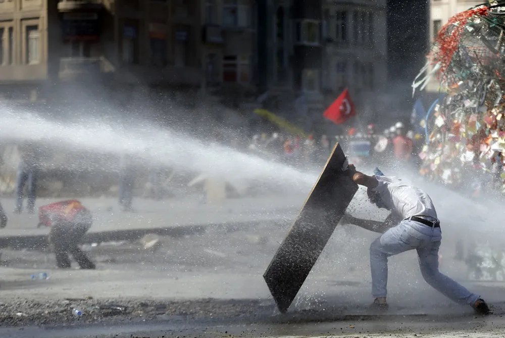 一名抗议者手持盾牌,试图在 2013 年 6 月 11 日的伊斯坦布尔塔克西姆广场冲突中阻挡警察水炮的水流。防暴警察向数百名手持石头和烟花的抗议者发射催泪瓦斯和水炮,试图重新控制这个位于激烈反政府抗议中心的伊斯坦布尔广场。路透社/奥斯曼·奥尔萨尔