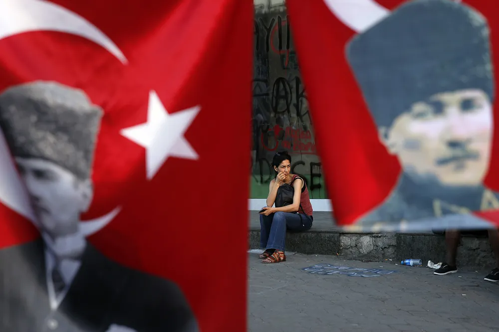 一名女性在伊斯坦布尔塔克西姆广场的土耳其国旗前被拍摄,国旗上描绘了现代土耳其的创始人穆斯塔法·凯末尔·阿塔图尔克,时间是2013年6月10日。路透社/雅尼斯·贝哈基斯