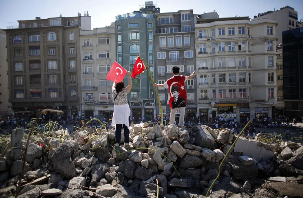 2013年6月9日,抗议者在伊斯坦布尔塔克西姆广场的盖齐公园举行示威时挥舞土耳其国旗。土耳其总理塔伊普·埃尔多安在周日发表了一系列挑衅性的演讲,呼吁他的支持者,数万名反政府示威者聚集在伊斯坦布尔市中心的塔克西姆广场。路透社/穆拉德·塞泽