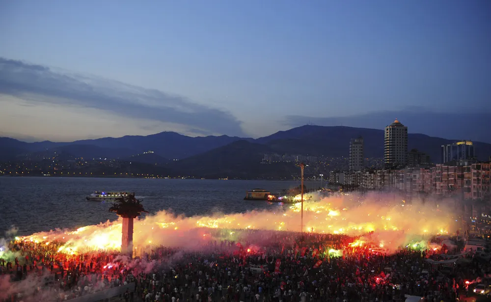 示威者在2013年6月8日晚上,在土耳其西部的爱琴海港口城市伊兹密尔的冈杜格杜广场进行反政府抗议时点燃了信号弹。土耳其总理塔伊普·埃尔多安的正义与发展党周六排除了提前选举的可能,因为成千上万的反政府示威者无视他立即结束抗议的呼吁。路透社/埃姆雷·塔泽古尔