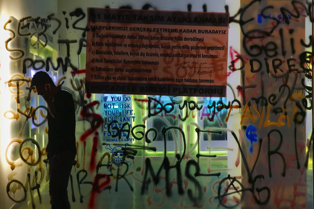 2013年6月9日,在伊斯坦布尔塔克西姆广场,反政府抗议者举行大规模集会后,一名抗议者在喷涂有反政府涂鸦的商店橱窗前打电话。土耳其抗议组织者呼吁在周日举行示威,以继续施压政府,要求解雇对暴力警察镇压负责的人,并放弃重新开发伊斯坦布尔市中心广场的计划。路透社/Yannis Behrakis