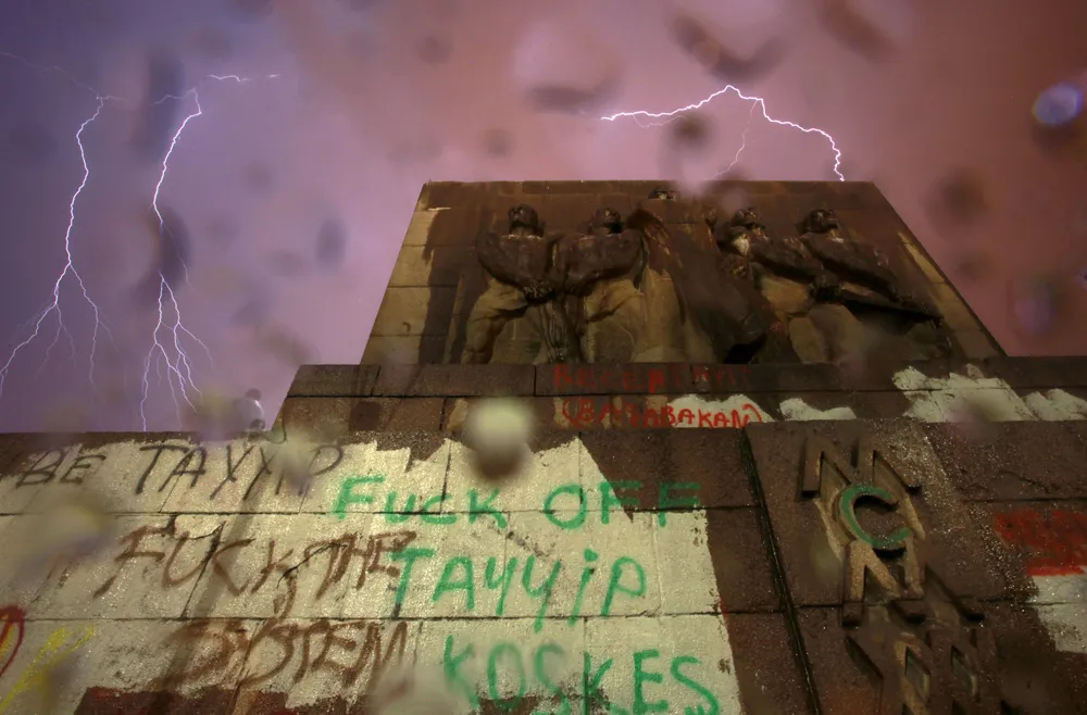 2013年6月8日,在安卡拉市中心的雷电风暴中,一座被反政府涂鸦覆盖的纪念碑被拍摄下来。路透社/Dado Ruvic