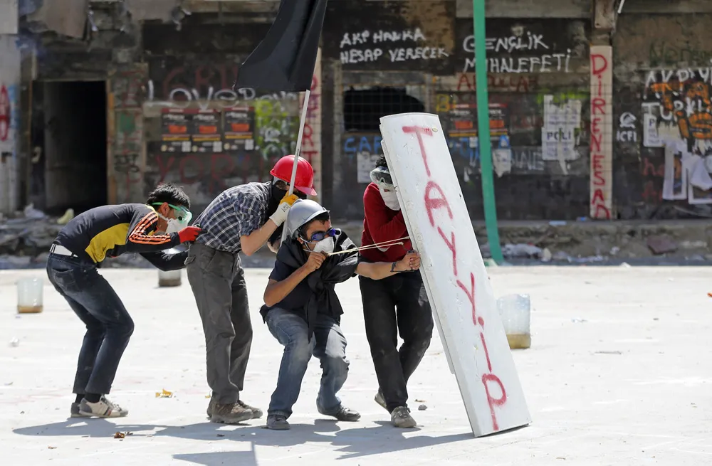 抗议者在2013年6月11日的伊斯坦布尔塔克西姆广场抗议中躲在盾牌后面。土耳其防暴警察在周二向数百名手持石块和烟花的抗议者发射催泪瓦斯和水炮,试图重新控制这个位于激烈反政府示威中心的伊斯坦布尔广场。路透社/穆拉德·塞泽尔