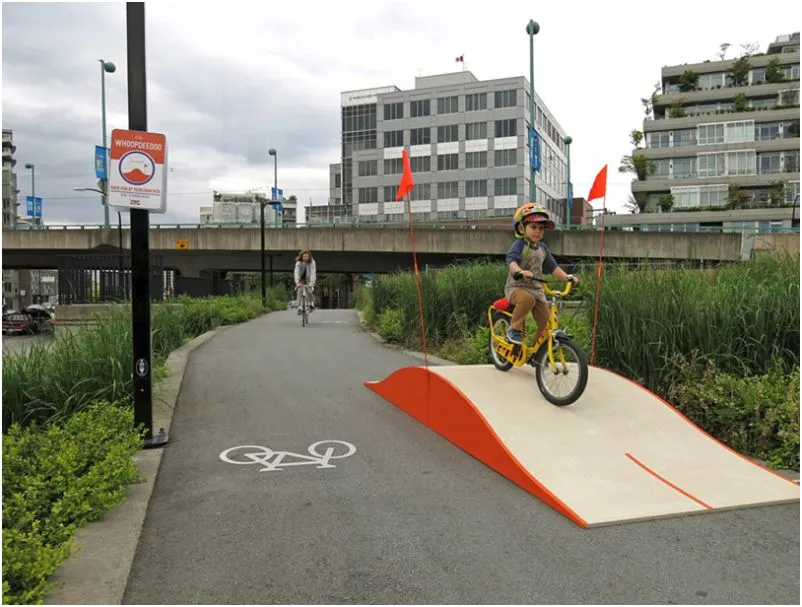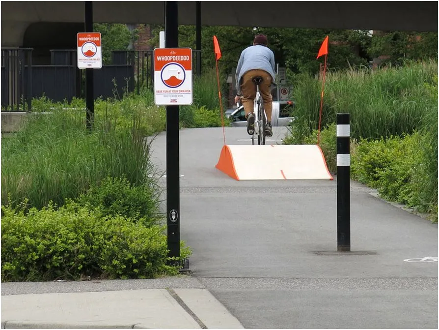温哥华市正在努力开发更多的自行车道,但遭到许多司机的抵制。我认为Whoopdeedoo项目是开始讨论城市交通的好方法。骑自行车快速、有趣、简单且健康(还有更多好处)。对于很多人来说,这是一个很好的出行方式。我想用一些有趣的东西来奖励骑自行车的人,同时也让司机能看到这个奖励,以理想地鼓励他们离开汽车,骑上自行车。这个坡道的过渡平滑,比城市里大多数减速带更容易骑过,适合所有年龄和舒适度的骑行者。