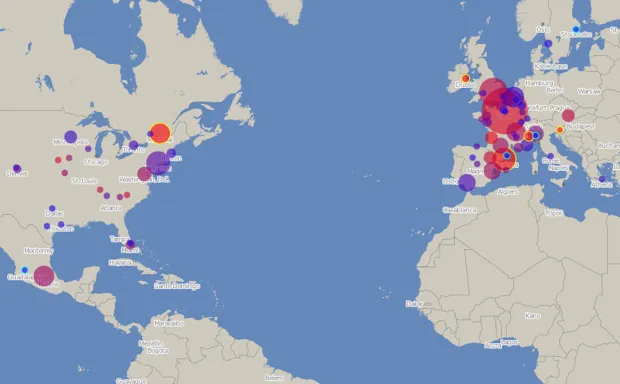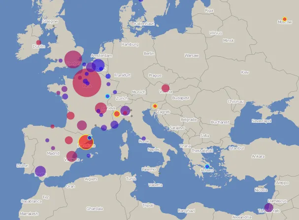 这里是欧洲(当地时间傍晚),最大的系统(按码头数量)以更大的圆圈显示。蓝色系统的使用自行车较少,红色系统的使用自行车最多可达20%: