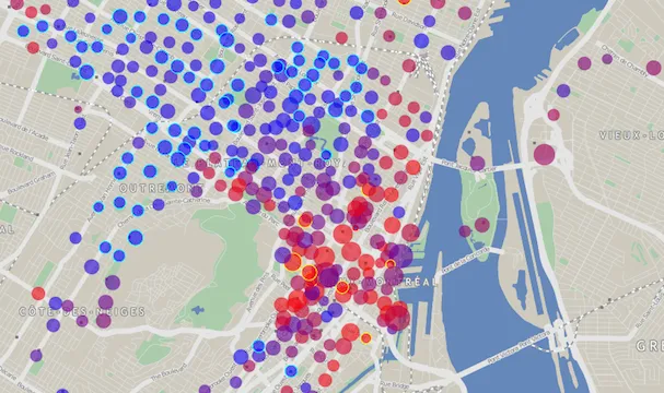 与此同时,跨越大洋,这里是蒙特利尔的系统,空码头用蓝色表示,满码头用红色表示(同样,它们按大小缩放):