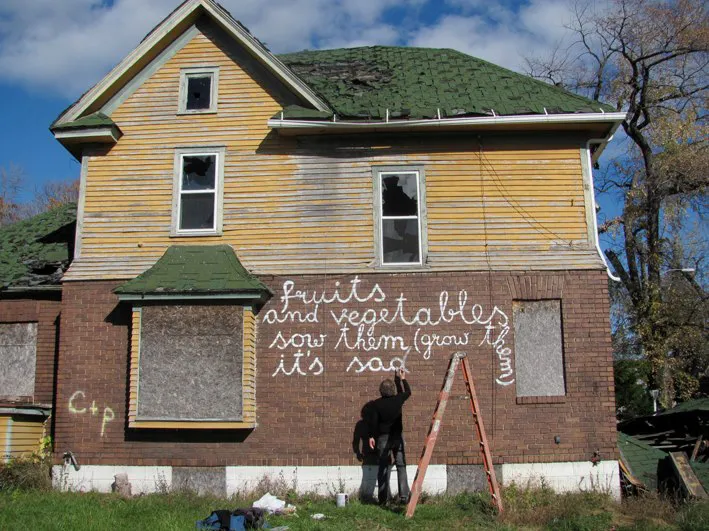安德鲁·帕金斯:我们以一百美元的价格从土地银行购买了一栋百年历史、16个房间的废弃房屋,条件是我们将其恢复到可居住状态。我们的员工住在那里,我们在这里举办了聚餐、艺术展览和电影放映,并同时接待了来自全国各地的十多位艺术家。更重要的是,这栋房子让我们能够与弗林特的人、地方和事件紧密相连——无论好坏。