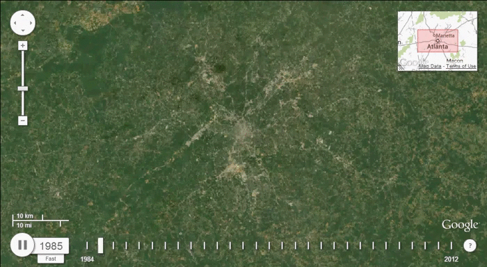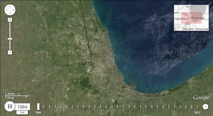 这里有一些他提到的其他 sprawling 城市,从芝加哥对周边平原的主导开始(要查看完整的 GIF 集,请访问这个 Flickr 页面):